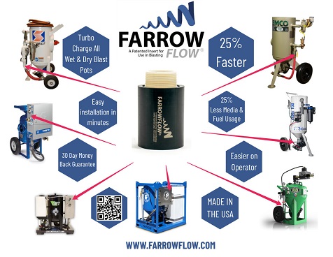Farrow Flow Insert is a Sandblasting Enhancing Accessory designed to be easily installed into the air outlet of any blast machine. State of the art technology that twists the air in a vortex motion creating an optimal mixture at the nozzle. THE RESULT, 25% wider spread at the nozzle while saving 25% in time, media, and fuel consumption. The Farrow Flow Insert works on dry blast pots, wet abrasive pots, dry ice blasters, blast cabinets and blast rooms. MONEY BACK GUARANTEE from the manufacture.